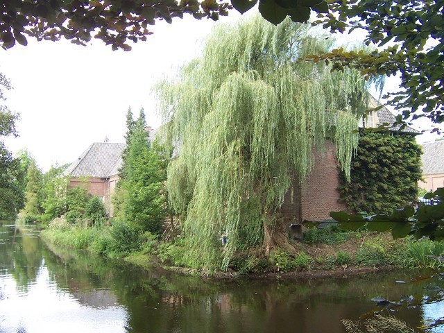 Aan de achterkant van de gracht kijk je tegen deze treurwilg aan die de bijgebouw van het kasteel verhult.